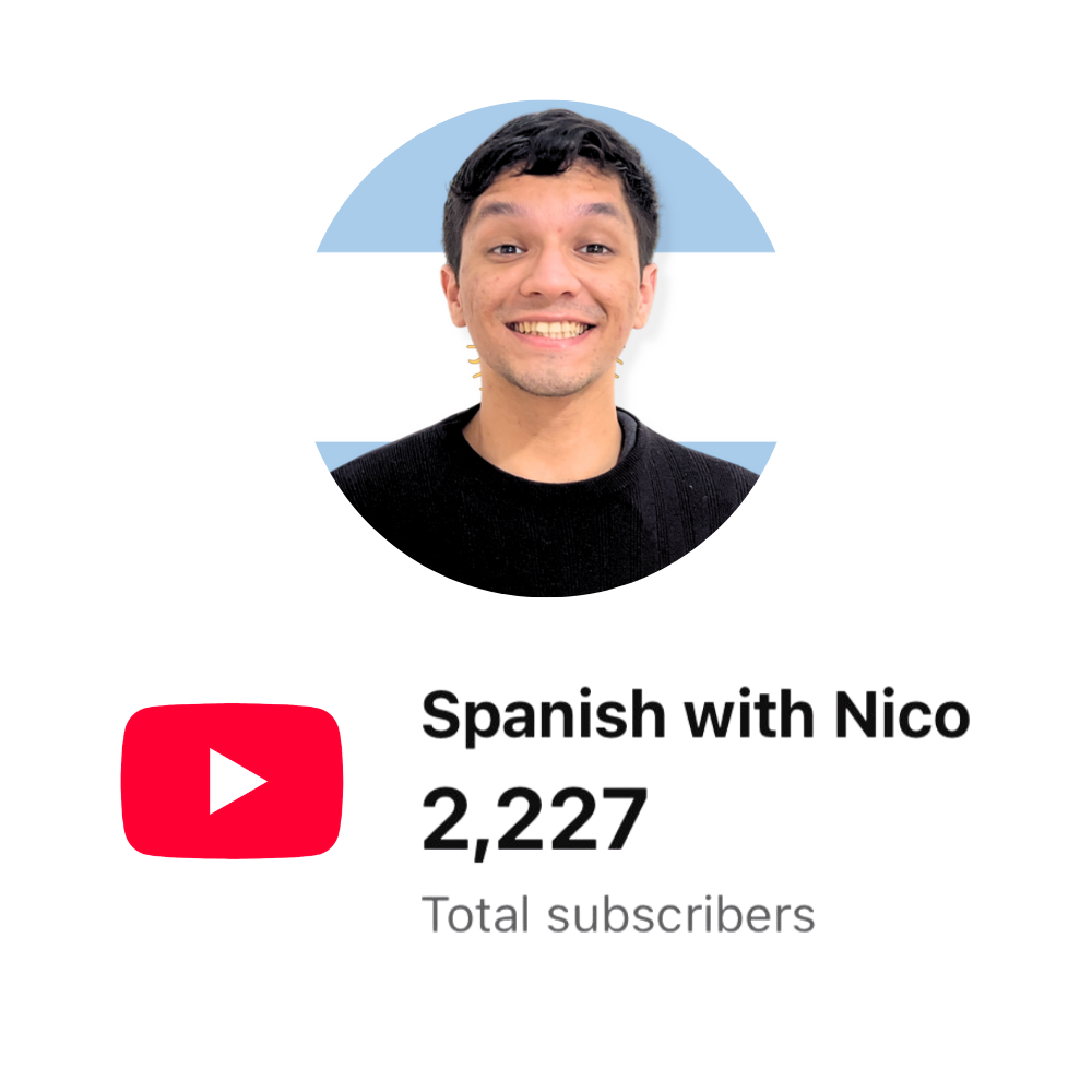 Hola! I am Nicolas Gonzalez Miño, also known as «Spanish with Nico«, I’m the founder of Spanish Mindset and one of the biggest YouTube channels about Argentinian Spanish, Spanish with Nico on Youtube (2,2k subscribers), Spotify & Apple Podcast. I am a teacher of Argentine Spanish from Argentina, Buenos Aires.